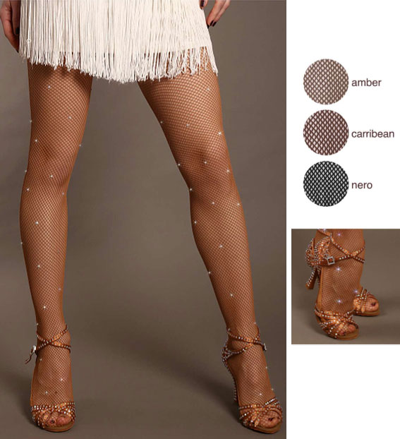 Professional dance seamless fishnet tight for Latin and ballroom dancers decorated with Swarovski AB stones all over.