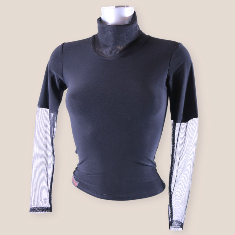 Long sleeve high collar elegant black top. Ideally to go with a long ballroom skirt to complete your whole dancing look. In stock size S/M Available in black