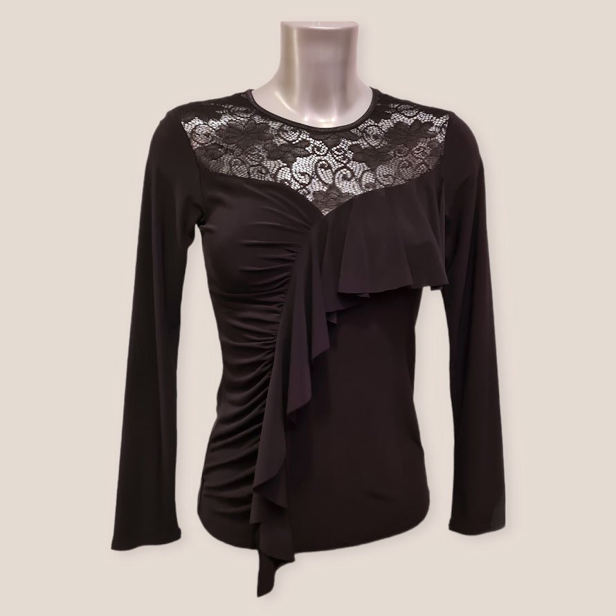Long sleeve elegant black lace top. Ideally to go with a long ballroom skirt to complete your whole dancing look. In stock size S/M Available in black