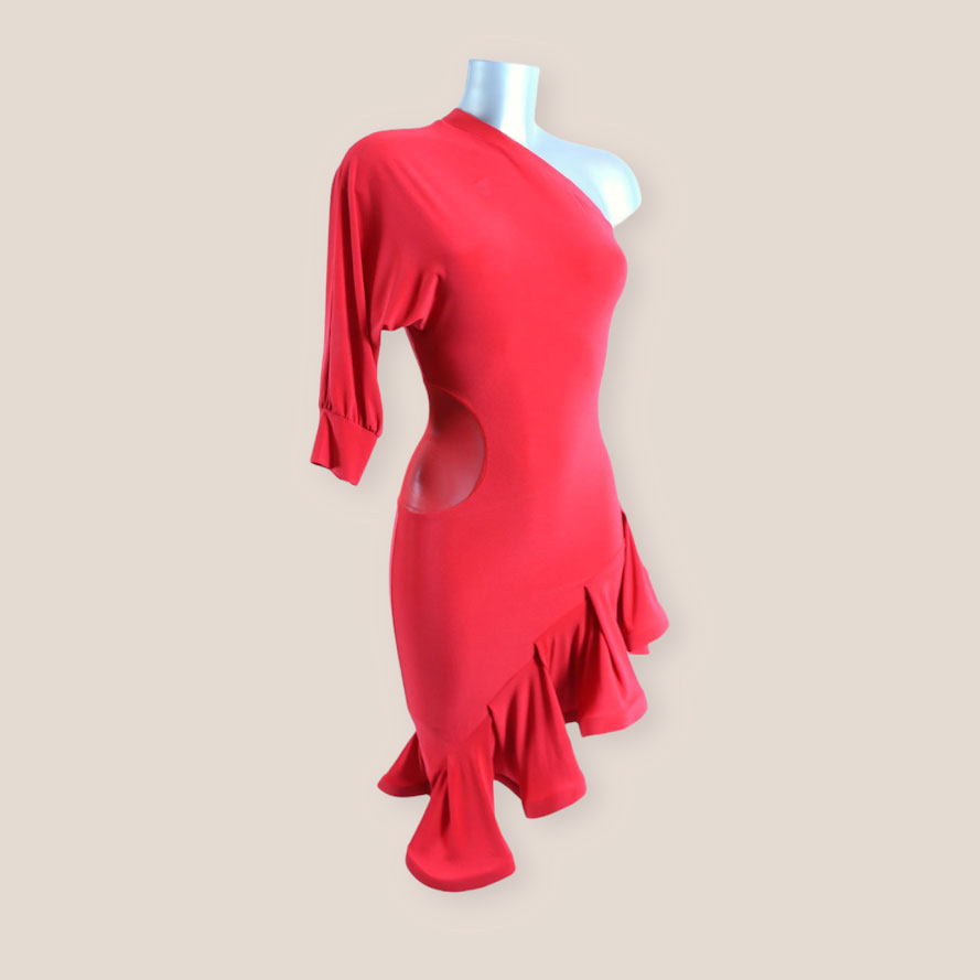 Robe de danse latine asymétrique à une épaule avec résille extensible transparente pour marquer votre taille.