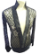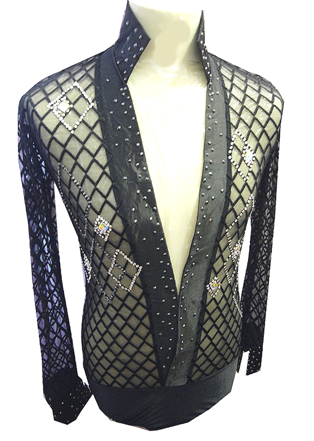 Chemise latine pour hommes tendance entièrement en dentelle quadrillée avec un col haut en satin. Le motif spécial de la dentelle est décoré de strass classiques pour lui donner plus de lumière.
