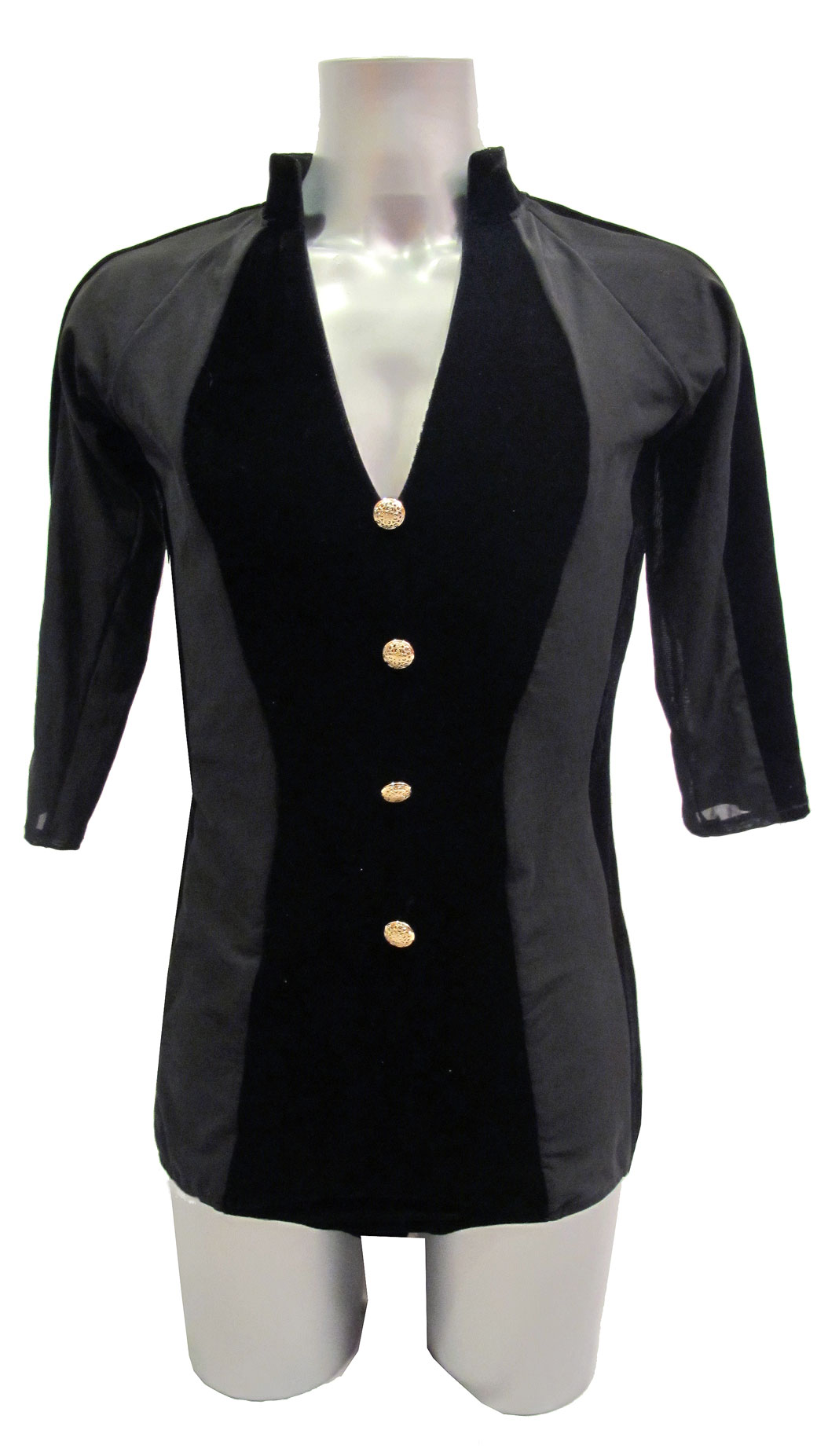 Veste pour homme d'inspiration militaire en velours et résille. Il est conseillé de choisir une taille plus petite si vous souhaitez que le design soit près du corps car la résille est très stretch.Il y a 4 boutons dorés devant, des manches 3/4 et une culotte intégrée.