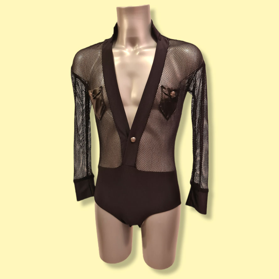 Chemise de danse latine pour homme en résille losange stretch et transparente avec des poches en simili cuir. Ce modèle comprend un slip.