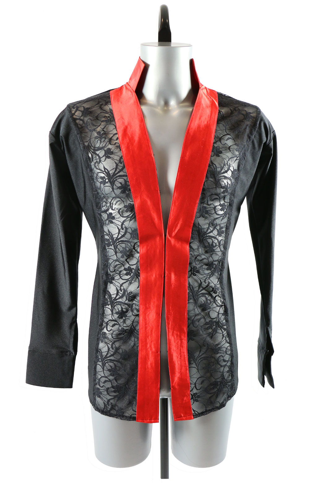 Haut latin pour hommes en lycra et dentelle transparente. Le col en V est en satin. Ayez un look très tendance avec cette chemise latine ouverte et sans slip ni boxer intégré.
