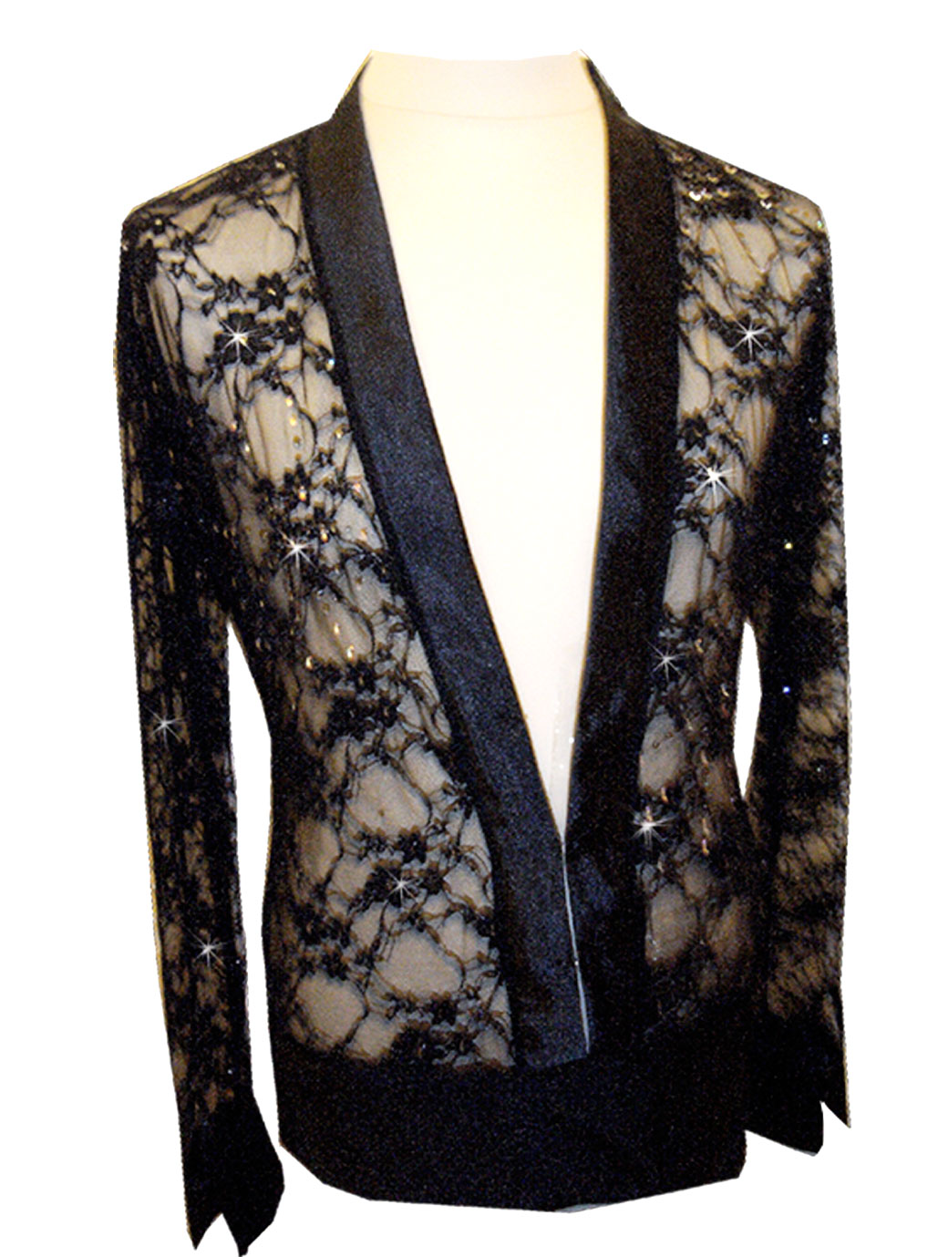 Chemise latine en dentelle élastique noire avec deux bandes de satin sur le devant. Ce modèle parfait pour vous rendre plus visible sur la piste de danse est entièrement orné de strass Classic Crystal.