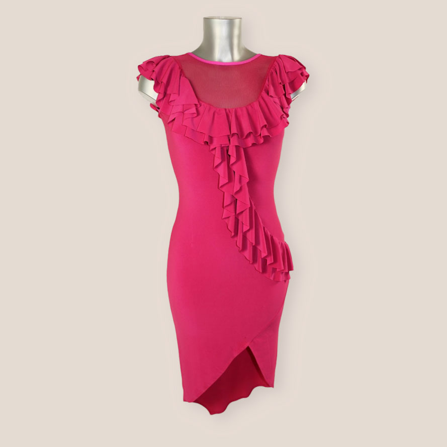 Robe simple de danse latine sans manches et au col rond. Les volants décorant le haut donnent une touche originale à ce modèle.