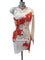 Robe de danse latine au design original et particulièrement lumineux. Ce costume est décoré de manière raffinée avec des motifs de guipure rouge, des franges de perles et des strass pour étinceler sous les projecteurs.