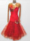 Robe de danse de danse de salon en velours rouge au style si romantique et décorée de magnifiques motifs en broderie et de plumes. La jupe est composée de plusieurs épaisseurs pour créer une superbe impression de volume sur la piste de danse.