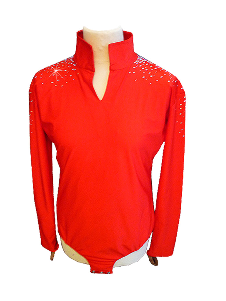 Made to measure shallow v neck front,high-collar latin men's top with attached brief below and decorated with classic crystal stones.