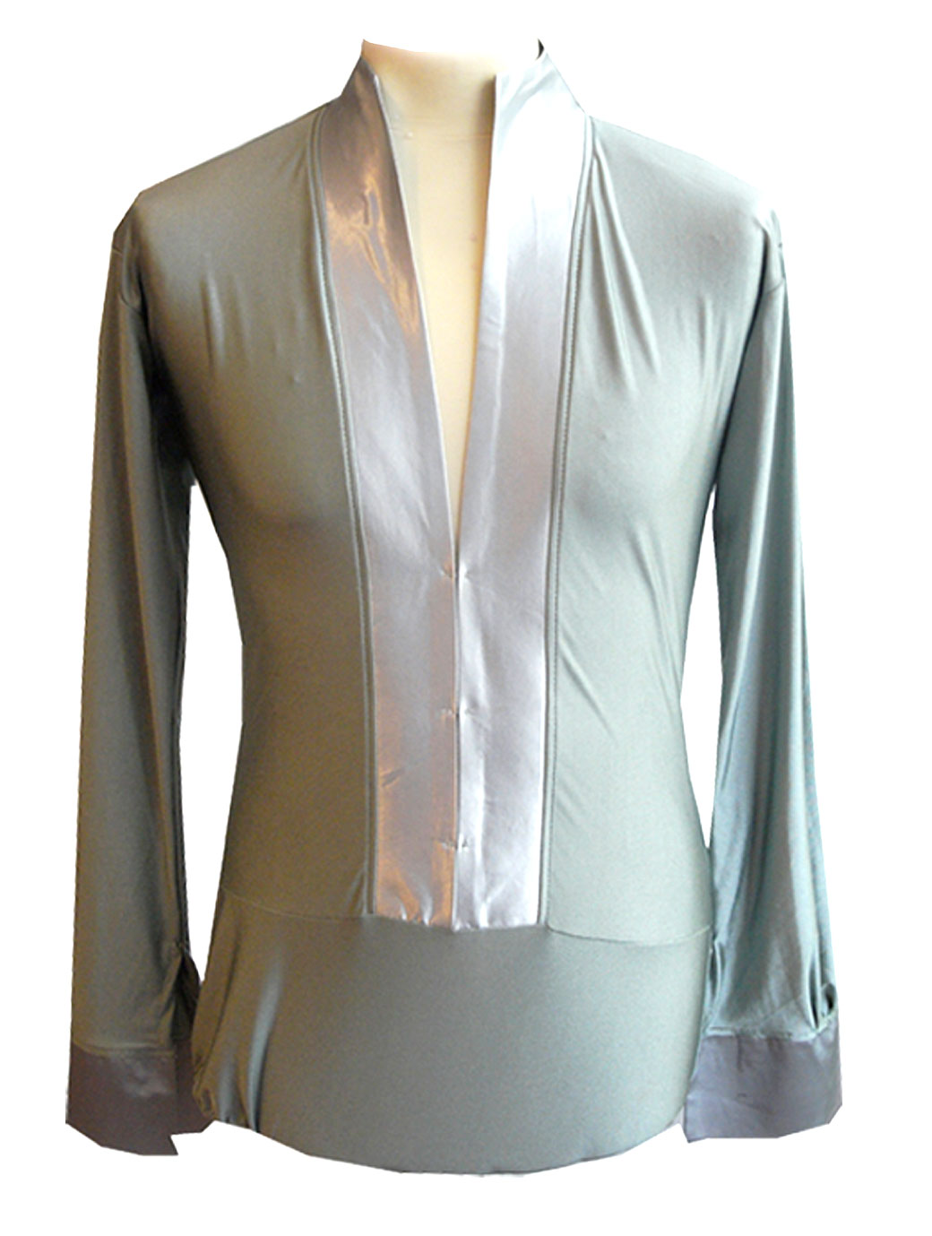 Latin men's top with a low V front made of satin wide strips and hidden hooks for you to ajust the front opening. This latin shirt is built with a brief below.