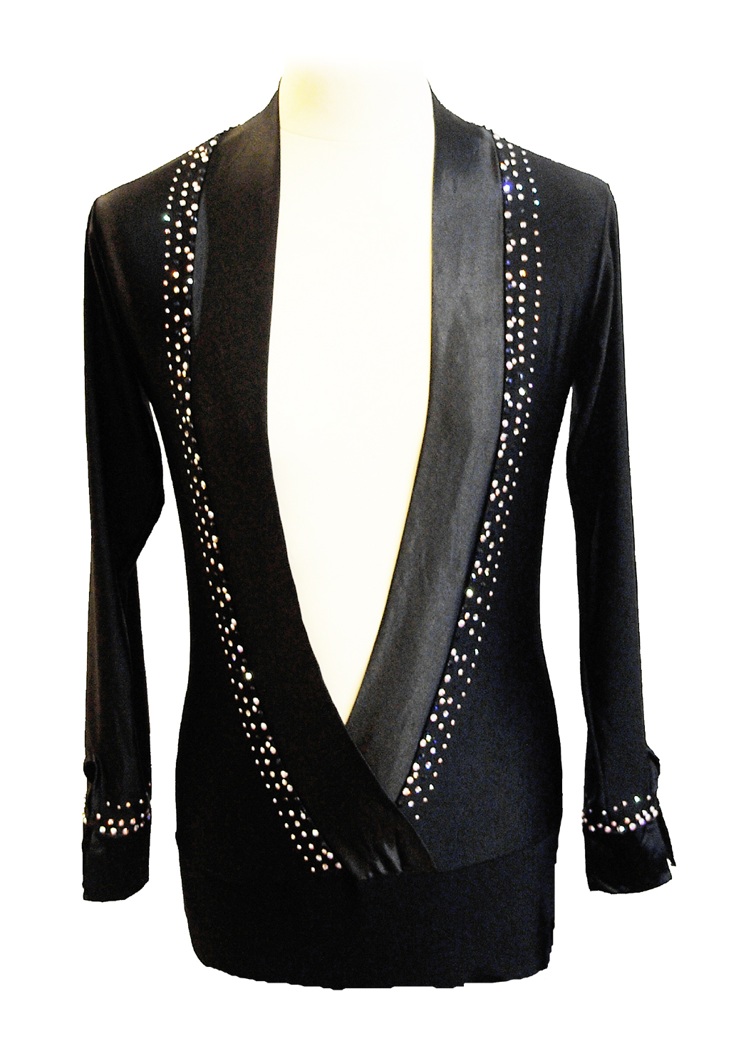 Elegant black stretch lycra latin shirt with a satin open front for a competition style. Latin men dancewear sewn with a brief.
