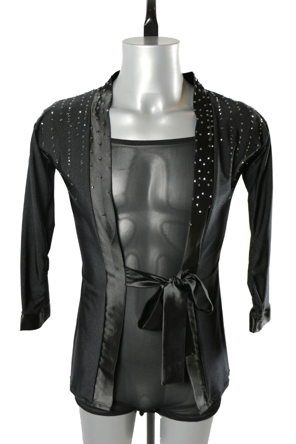 Two pieces style Latin Men's dance shirt with a tie-up design satin belt to the side.