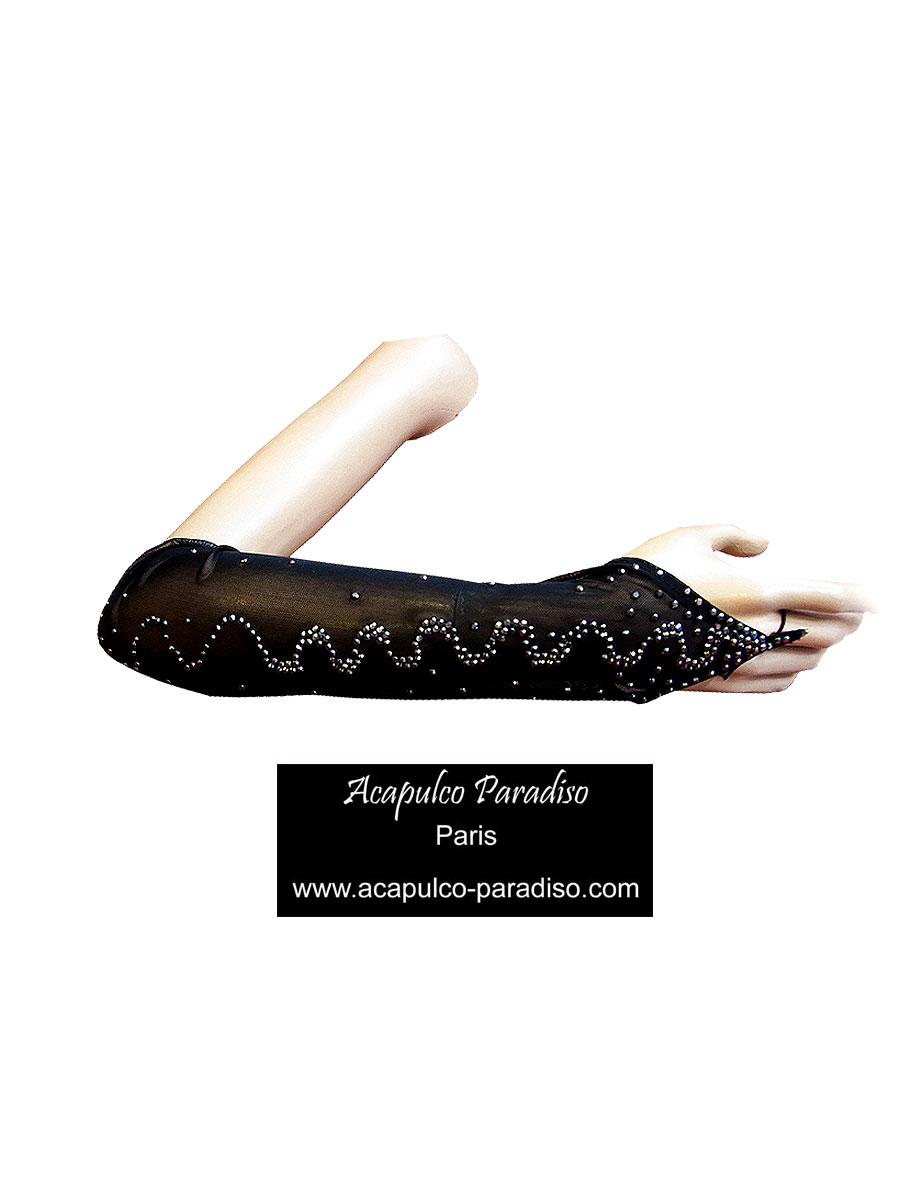 Special stretch see-trough mesh fabric gloves fully decorated with classic crystals.