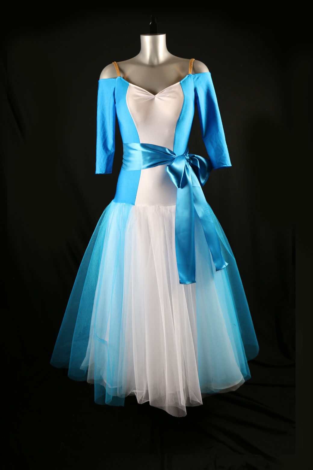 Elegant blue and white ballet TUTU skirt style ballroom standard dance dress decorated with romantic big ribbon bow belt.