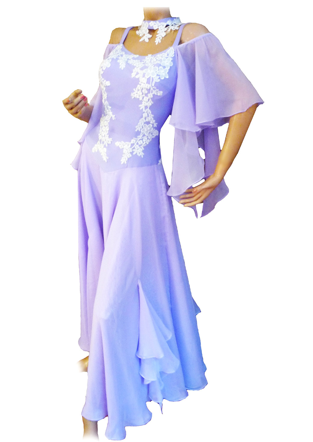 Graceful made to measure ballroom gown with romantic off-shoulder long ruffles sleeves. Dress is with full bodysuit inside, bra cup and a snap panty.