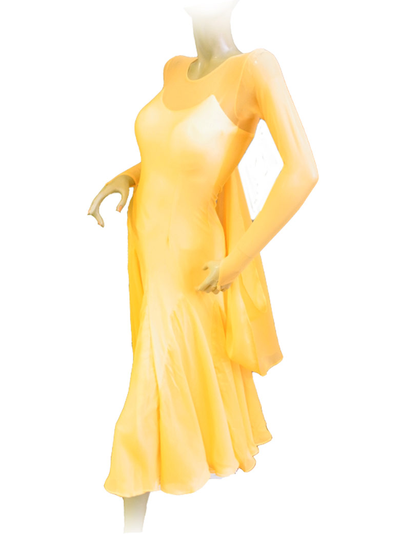 Colourful two long see-through mesh sleeves ballroom dress. This waltz gown is with a bodysuit inside.