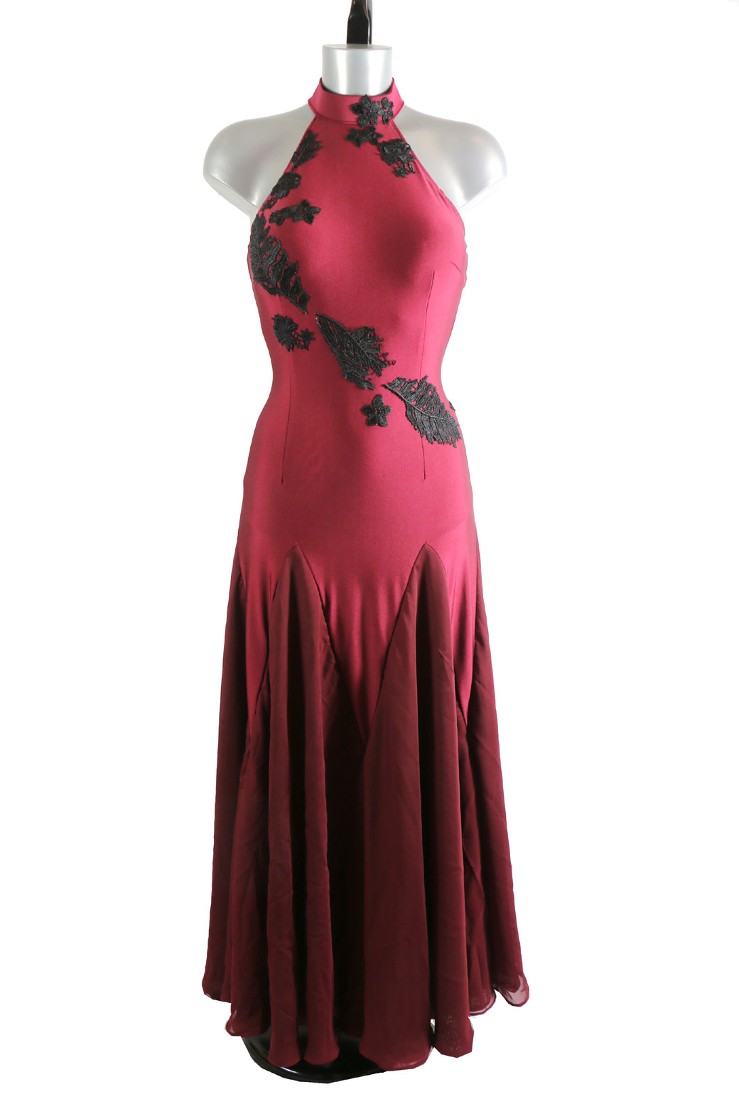 Graceful ballroom dance costume with delicated black guipure motifs and elegant crossed back design.