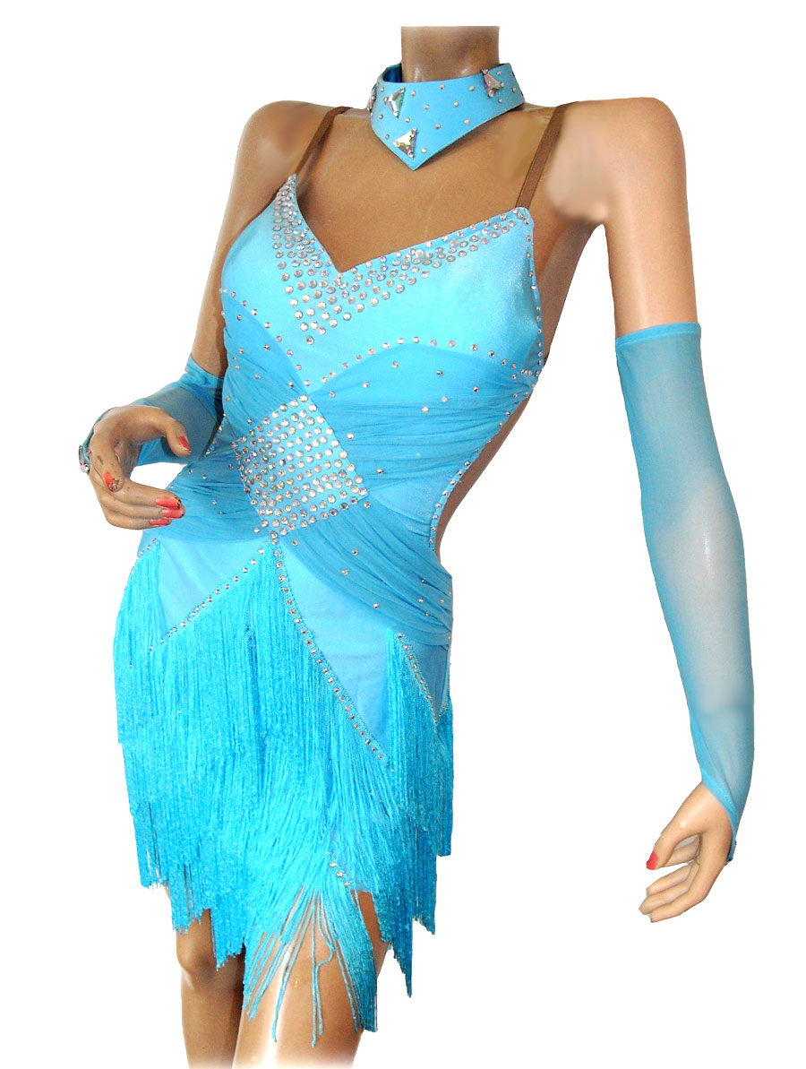 Sexy blue latin dress with a fringes skirt to enhance your dancing movements.