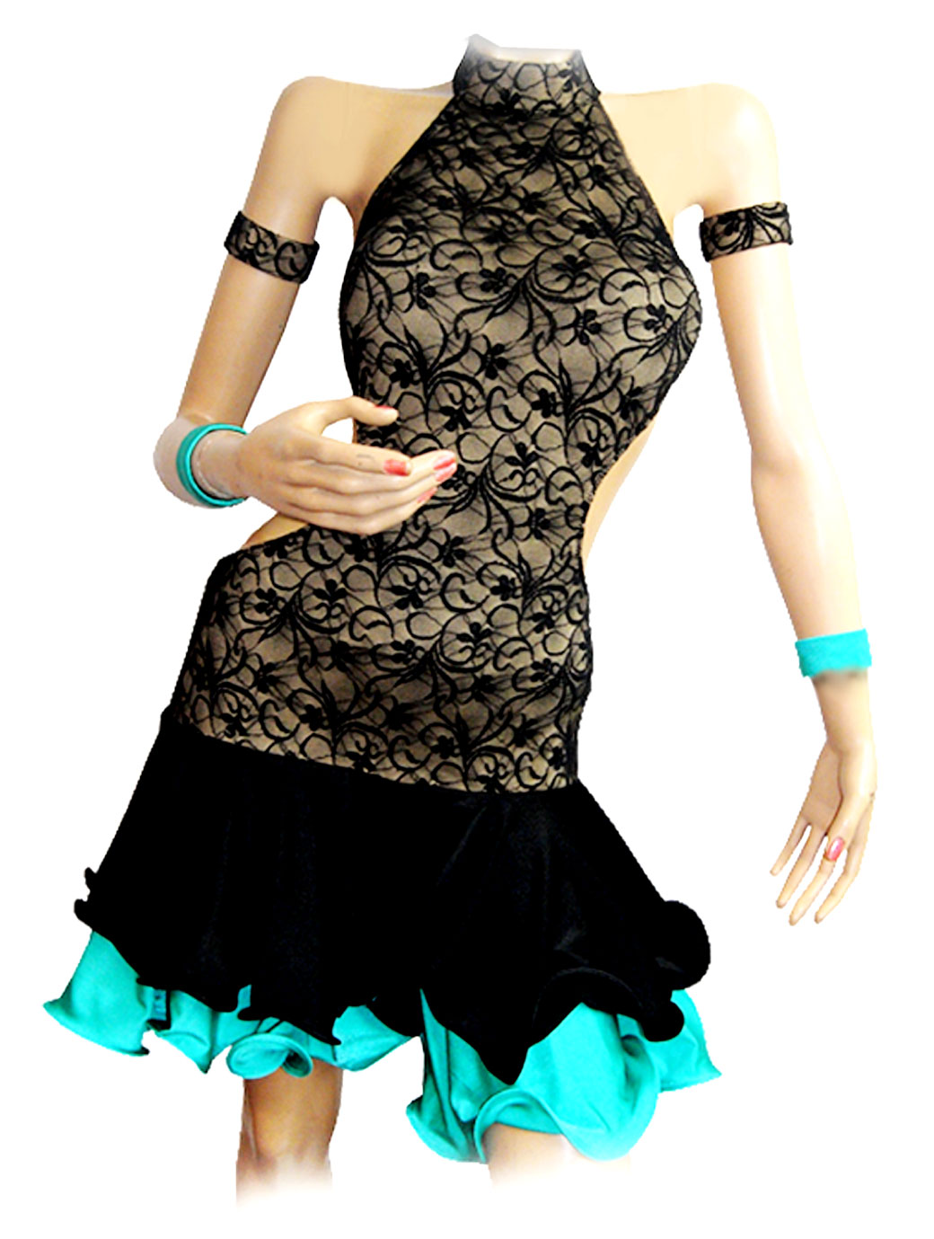 Custom lace latin competition dancewear with two layers of different length fishwired lycra skirts. Skirt moves very well like big wave on the dancefloor,but still stays down after movement completed.