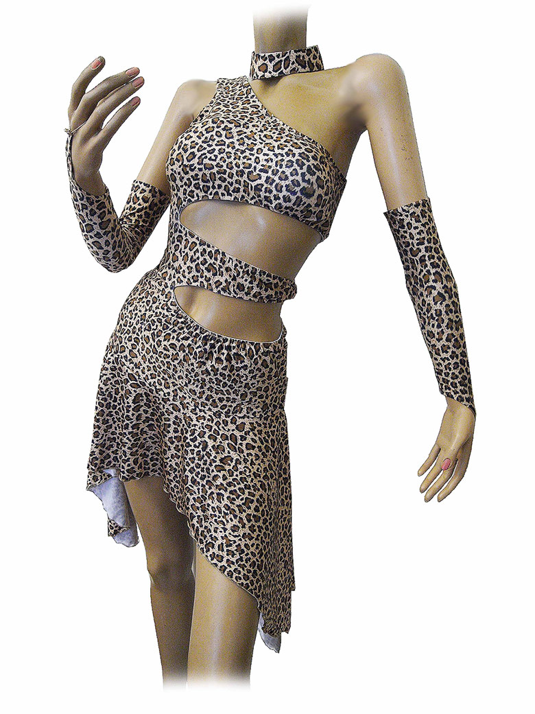 Leopard printed lycra sexy latin dress. Dress is with bra cup and close panty. Additional accessory: a set of gloves and necklace included.