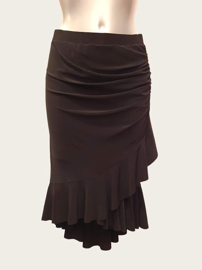 Elegant pleated front design Latin dance skirt, ideal for tango or any kind of Latin dance. In stock size S,M,L at color black in our showroom.
